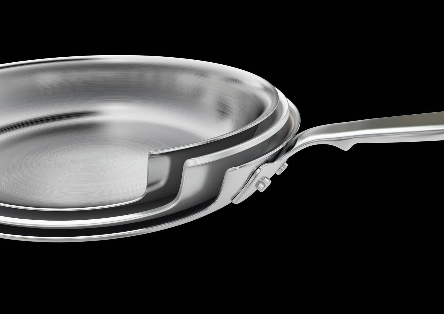 The cookware's durable three-ply construction features an aluminium core between layers of stainless steel for excellent, efficient heat distribution all the way up the sides of the pan.