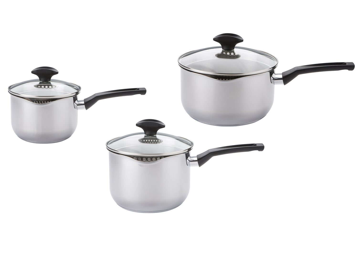This Cook & Strain 3 piece saucepan set includes 14, 16 and 18cm straining saucepans - ideal for those looking to upgrade or start their kitchen cookware collection. Stylishly designed, these pans have been made using quality stainless steel for excellent cooking performance and durability.