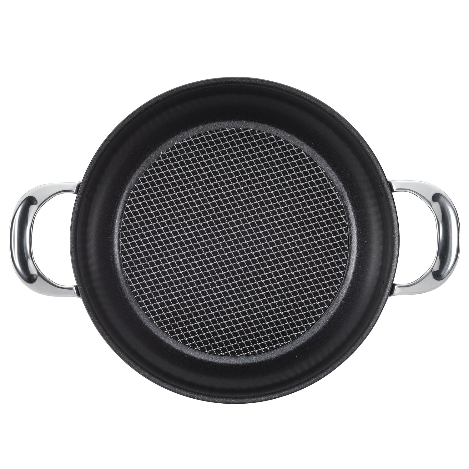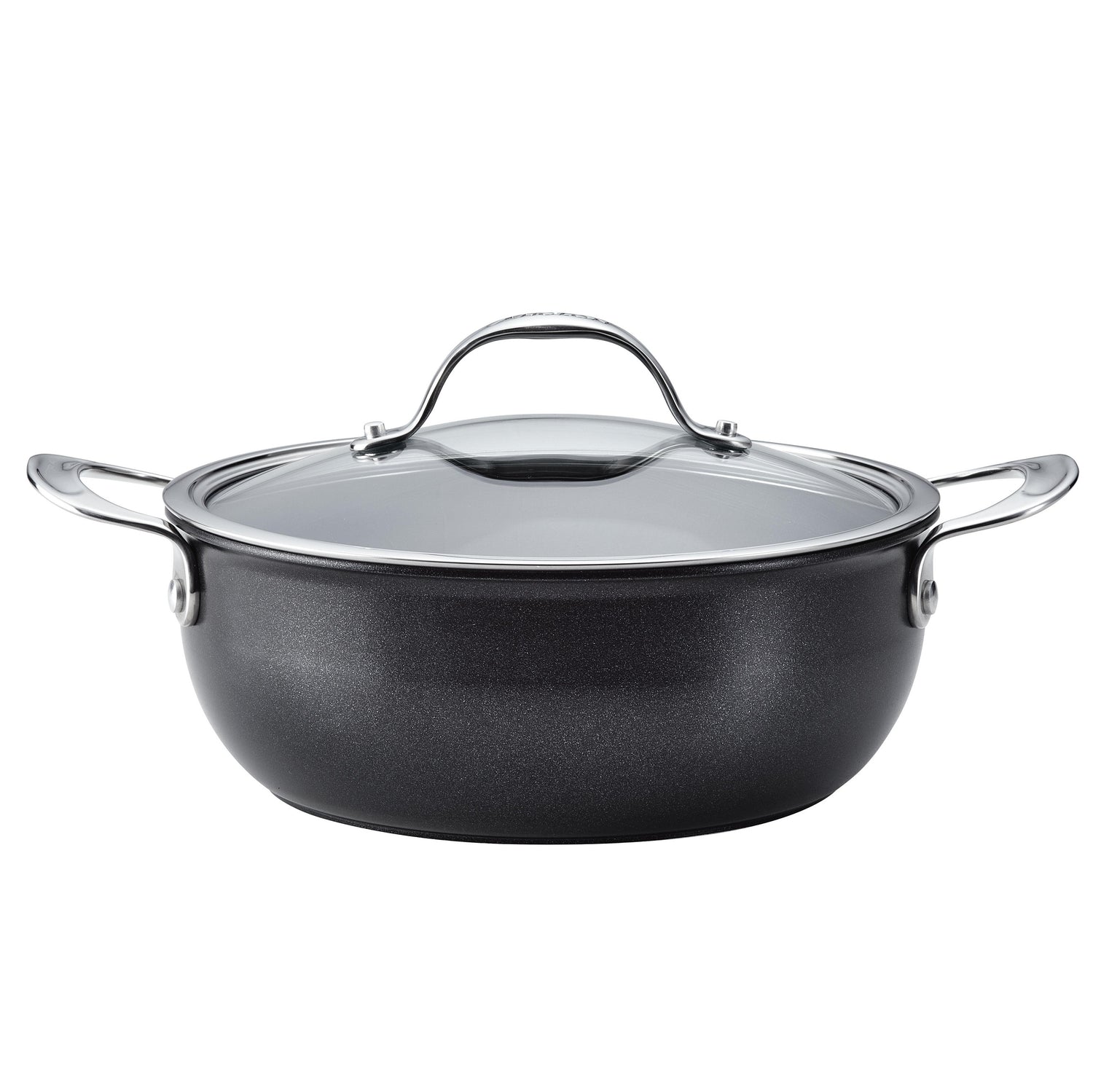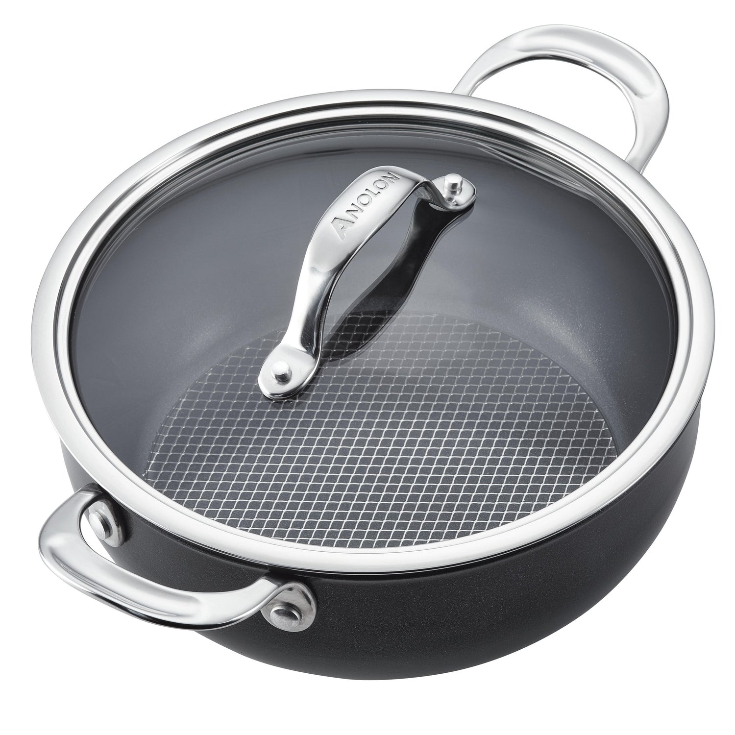 The first hybrid non stick Dutch oven style pan designed to sear like stainless steel, this Anolon X 3.8 litre 24cm non stick casserole dish with lid features a thick, uniquely constructed stainless steel base to keep cooking surfaces uniformly flat while delivering impeccably fast and even heat.